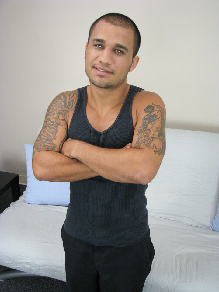 Rafael is straight and a bit of a player who likes the Latinas. He has been laid off and needs money for the basics. Agreeing to jerk off, he removes his shirt and I check out his body, which is toned; he has a couple of tattoos on his upper torso and stands about 5'5" tall. As he takes off his shorts, we see a true Latino, larger than average, thick and uncut. Sitting back down, I ask if he has ever been hit on or done anything with guys, "no, but I see them looking at me and I am comfortable with that" her remarks. I ask if it would be okay if he and another model jerk off together, "yeah" answers Rafael; I have Eddie bring Alex in, who is fine with the two of them together as well.