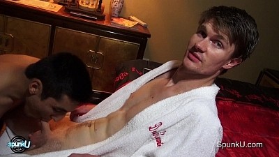 Pulling a Christmas video that hadn't aired before, we have Jason Jimeno "tickling the Keys" of Sean as well as licking the boy's sack. Jason works on being naughty while Sean lies back and feels nice; they go from the showers to a "shower." This SpunkU.com film is so "cheeky."