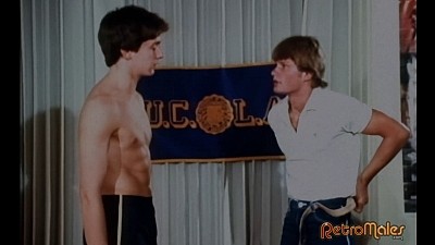 Helpful indeed, John welcomes Jacques warmly, though maintains a bit of mystery about his personal life. He even gives his new roommate a pair of gym shorts to try on. The two take turns shedding their shirts and putting on shorts, each sneaking glances at the other. Both men have fit, athletic builds and clearly appreciate each others' good looks. After John departs for a date, Jacques remains excited and must relieve himself with a long solo session on his bed. He strokes his long, thick cock to climax.