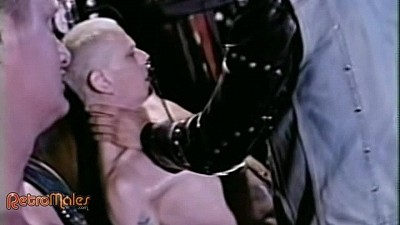 Harry Ros, a topman, enters the bar and begins to terrorize a wimpy-looking guy, Paul V. Rooy. Ros slaps him in the face and then chains him up with a long set of links, adding extra clamps for his tits.