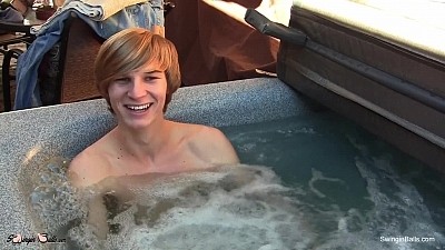 Relaxing in the warm jets of an outdoor jacuzzi, William Steel has the floppy blond bangs and lean smooth body of a 1980s porn god. When he stands, partly shaded by evergreen foliage, his symmetrical build and long, low balls grab our attention. He reaches up to toss back his thick straight hair like a Socal surfer, fueling all our retro fantasies.