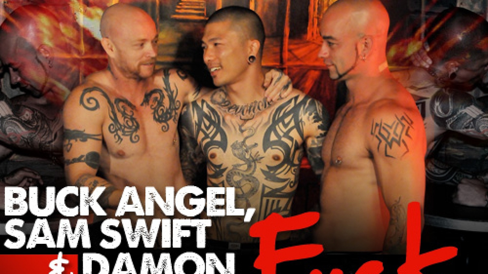 Two heads are good, but add a pussy and youve got Buck Angel, Sam Swift and Damon Dragon doing a three-way in the washroom, otherwise known as the head for Buck-Angel.com. I fucking love that smell of piss, moans Buck as he tugs at Damons cock. After Sam and Damon get after one another, Buck sits back and enjoys the action.