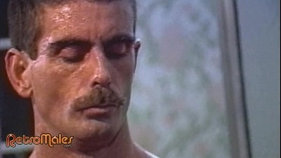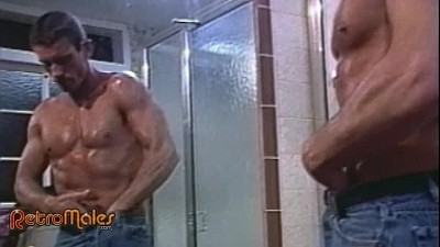 Back in the cabin's other bathroom, hot 80s mustache clone Will Seagers is oiling up and worshipping his lean, tough-muscled body while he checks his mirror reflection. The more he watches himself, the harder his cock pops up and out. He slaps it against his hairy trail and thick bushy pubes as he begins stroking from fuzzy root to shiny, gleaming head.