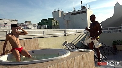 Up on the roof with Rio's iconic Christ the Redeemer statue glaring down from Sugarloaf, Hanry relaxes in an afternoon hot tub. Ebony Latin stud Vitor Guedes stretches out in an adjacent lounge, checking out the bulge in Hanry's teeny bikini. Hanry shields his eyes from the tropical sun to catch a glimpse of Vitor tugging his tool. He steps out of the tub to take Vitor's mahogany monster out of his yellow briefs and swallow it whole. Straddling Vitor's muscular chest, Hanry gets his ass eaten while he sucks. They stand to stroke their cocks together.