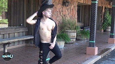 Daniel lets us in to some of the personal experiences of his gay development in recent years. He professes his love for Vegas, his adopted home and the flashy, bright light city of his dreams. We then see him decked out as a cowboy in a Western town, leaning against a sunlit column in black vest and ten-gallon hat. An added bonus is a quick peek at Daniel jerking his big cock on the high sleigh bed in the rustic cabin.