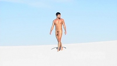 Bronzed, beautiful Dominic steps down from the crest of a tall white sand dune. Naked and alone, he strokes his powerful chest and reaches down to his hard uncut cock. Working up his strong sexual appetite, he falls to his knees and leans back to glide the skin over its smooth wet head. Using nature's lube, he drools a big wad onto his cock and beats harder. His nuts pull up tight as they boil up a hot load. Sperm shoots out and drenches his fist with its sticky reward. He throws his head back in satisfaction.