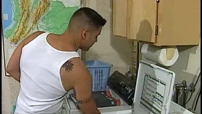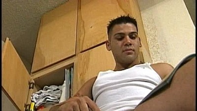 Its laundry day for Sergeant Jeremy and he strips off right in front of the washing machine so that he can wash every piece of clothing he owns. He hops up onto the washer and pulls out a gay skin mag to get his Latino cock hard. Jeremy moves back to the bedroom to get comfortable and continue his J/O session. He works his dick into a frenzy with his stroking until the Sarge pops a powerful load that covers his belly in cum that he rubs all over the rest of his body. A quick shower afterwards gets him as clean as is clothes.