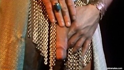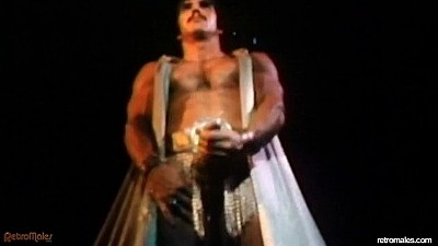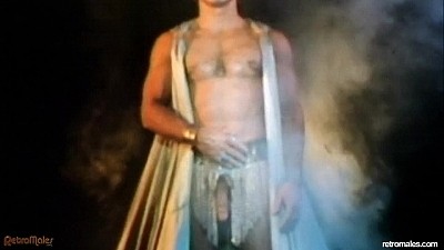 The film's stylized opening segment discusses the ring's powers in voice-over narration over shots of muscular Roger jerking off in a black room under colored lighting, fog sweeping around his mostly exposed form. He wears only a cape, an ornate belt with chains hanging from it (parted in the center to reveal his large cock) and the magical ring on his finger. He stares straight ahead unemotively and strokes himself. He shoots a large load, then dramatically raises his arms up into the iconic pose from the Sex Magic poster.
