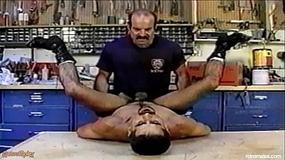 Tony strips off the leather and writhes on the shop table, twiddling nips while Marco jacks and sucks him. While he grabs a mouthful of furry ass, Marco gets the bright idea of rubbing the butt of his pistol into the musky crack before popping in a finger or two. While Marco rolls on a condoms Tony pumps his face with juicy Italian sausage. Tony is ready to get his ass reamed, and bumps back to meet every tough thrust. The muscles of his round butt cheeks ripple as he gets plowed, then he raises his shiny MC boots and lets his bud ram it home. he rides the mustached cop's meat, kissing and jacking till Marco jerks a load and he hoses down his own beating fist.