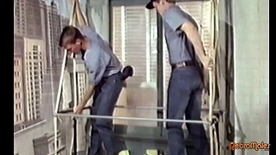 The final scene couples window washers Derrick Stanton and Tony Kennedy on top of a scaffolding outside a skyscraper high above Hollywood Boulevard, while people walk and watch below. This is probably the best segment in the video due to Kennedy's eager bottom action and Stanton's trademark huge load onto his ass after fucking him, which he soon laps off the boyish blond man's cheeks.