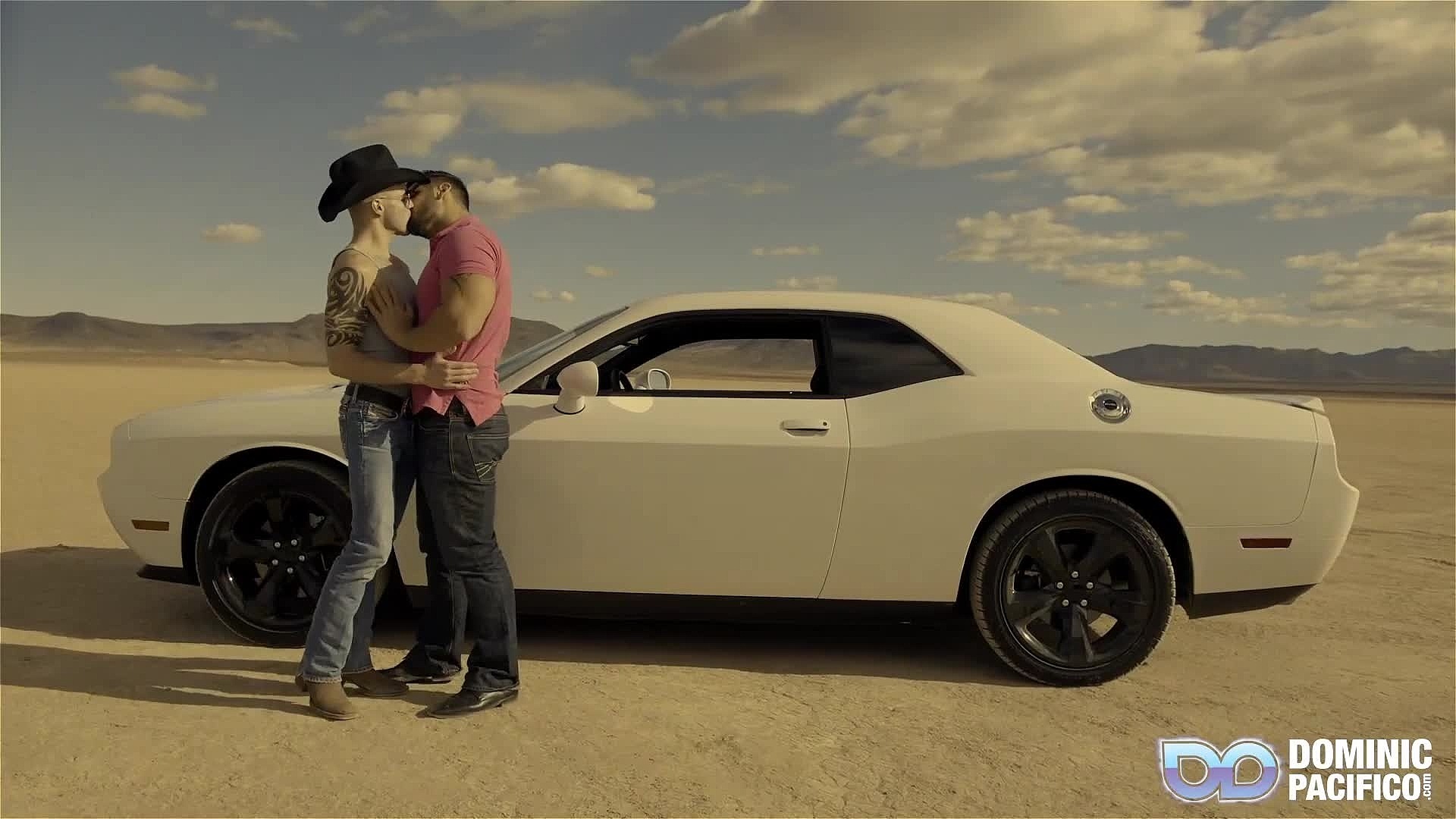 Back in the real world, Marcus veers off the road and Casey and he step outside and make out. As they kiss, both studs fondle each other's well-packed crotches and unbutton jeans. Casey falls to his knees and worships Marcus' thick uncut meat, grabbing behind his knees to pull closer. Casey sprawls across the hood of the car and gets a quick suck from Marcus, then they hit the road "back to the ranch"