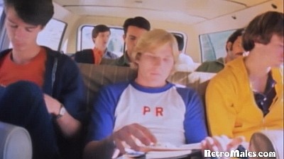 Heading out for a track meet, the guys load into a van. In the back, Don Ranger (Duff Paxton) makes himself comfy by grabbing Jamie's (Gavin Geoffrey) cock and sucking. Once the boy is hard, Don takes a seat and rides while Jamie lays his head back. At one point, Don even bends forward and asks another ***, "whatcha reading?" Close to cumming, Don puts his face back down and eats Jamie's cum.
